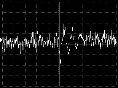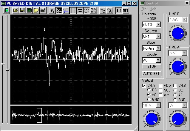 Empfindlichkeit pro Bildschirmteilung: 10 Millivolt (im Bild Vertical CH.A, Einstellung AC).