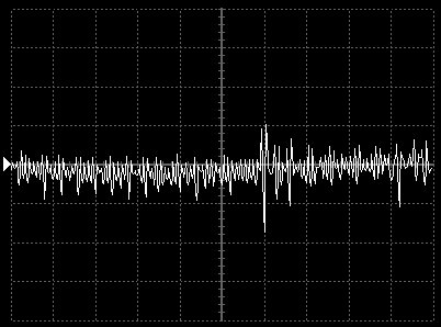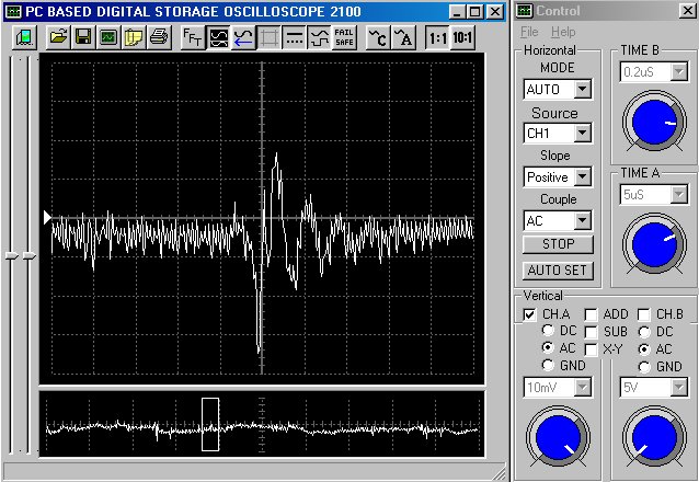 Empfindlichkeit pro Bildschirmteilung: 10 Millivolt (im Bild Vertical CH.A, Einstellung AC).