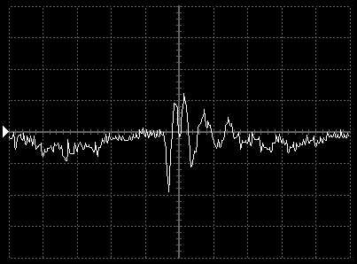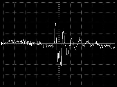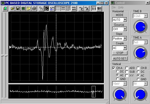 Empfindlichkeit pro Bildschirmteilung: 10 Millivolt (im Bild Vertical CH.A, Einstellung AC).