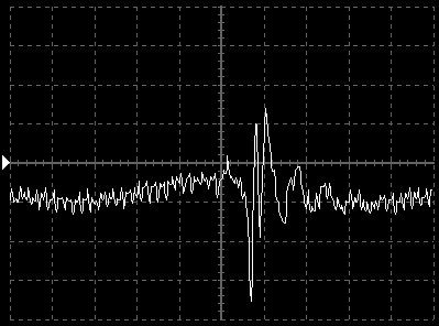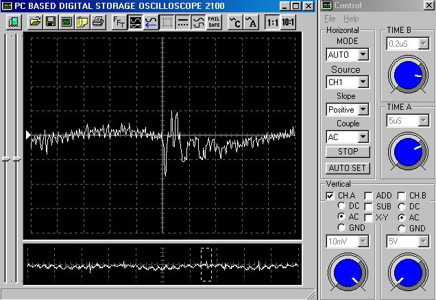 Empfindlichkeit pro Bildschirmteilung: 10 Millivolt (im Bild Vertical CH.A, Einstellung AC).