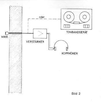 Wenn eine Wand des abzuhörenden Raumes zugänglich ist, ist es nicht nötig, einen Sender einzusetzen. Ein Mikrofon kann durch ein in die Wand gebohrtes Loch in den Raum gebracht werden. Entweder man versucht das Mikrofon hinter einem Schrank oder der Fußleiste zu installieren oder man bohrt direkt bis unter die Tapete, ohne diese zu beschädigen.
