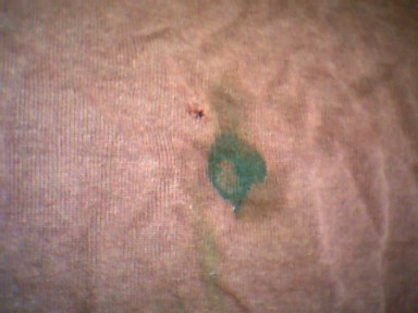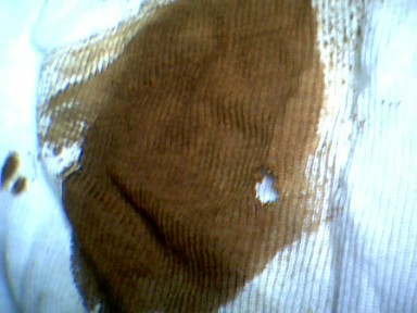 Das nächste Bild zeigt den Einstich in das getragene Unterhemd und den großen Blutfleck.