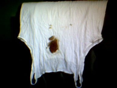 Das dritte Bild zeigt das getragene Unterhemd und lässt die Größe des Blutfleckes erkennen.