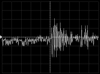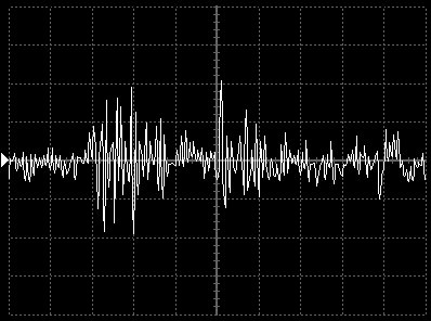 Empfindlichkeit pro Bildschirmteilung: 10 Millivolt (im Bild Vertical CH.A, Einstellung AC).