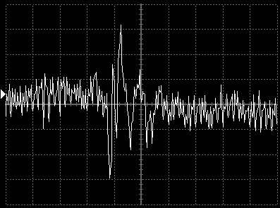 Empfindlichkeit pro Bildschirmteilung: 10 Millivolt (im Bild Vertical CH.A, Einstellung AC).