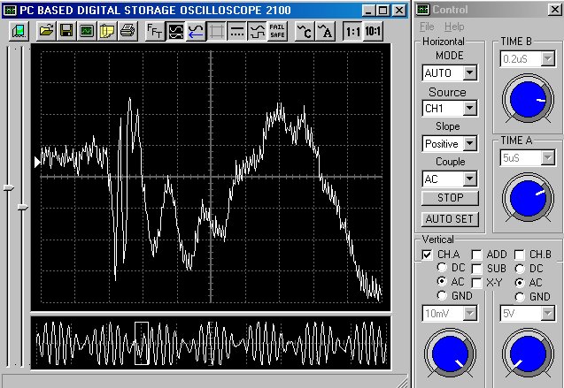 Empfindlichkeit pro Bildschirmteilung: 10 Millivolt (im Bild Vertical CH.A, Einstellung AC).