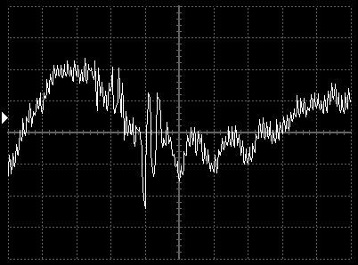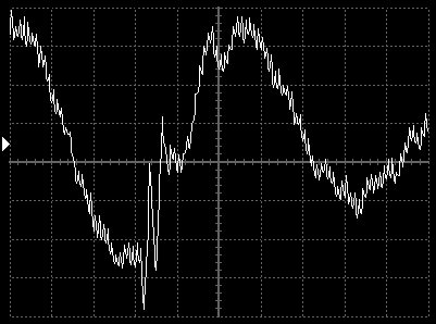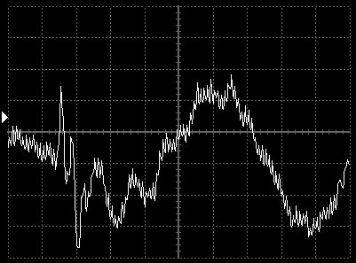 Das folgende Bild gibt das selbe Signal wieder. Das Signal wird durch Überlagerung durch den Mittelwellensender vom Oszilloskop verzerrt dargestellt. Trotzdem läßt sich aber erkennen, daß es sich um das gleiche Signal handelt.