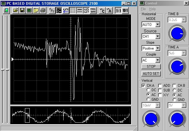 Empfindlichkeit pro Bildschirmteilung: 10 Millivolt (im Bild Vertical CH.A, Einstellung AC).