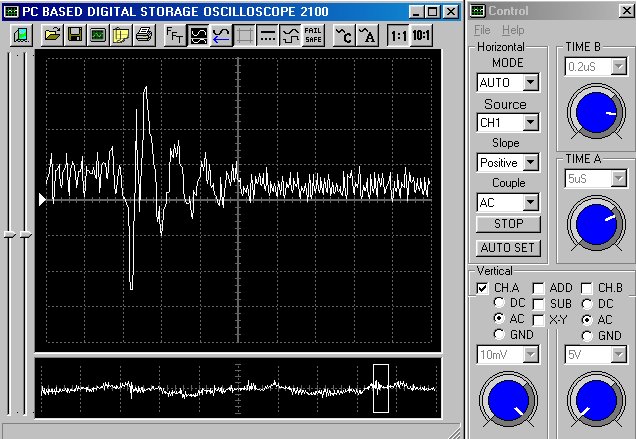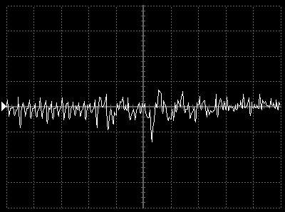Empfindlichkeit pro Bildschirmteilung: 10 Millivolt (im Bild Vertical CH.A, Einstellung AC).