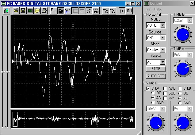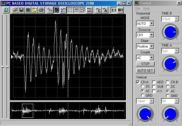 Empfindlichkeit pro Bildschirmteilung: 10 Millivolt (im Bild Vertical CH.A, Einstellung AC).