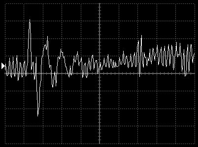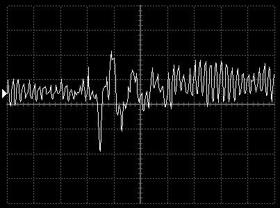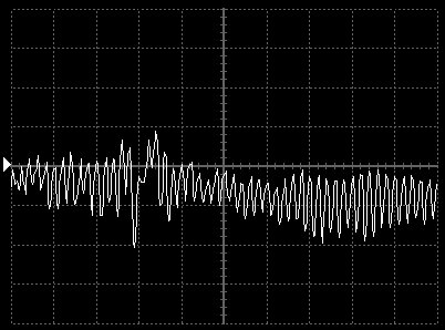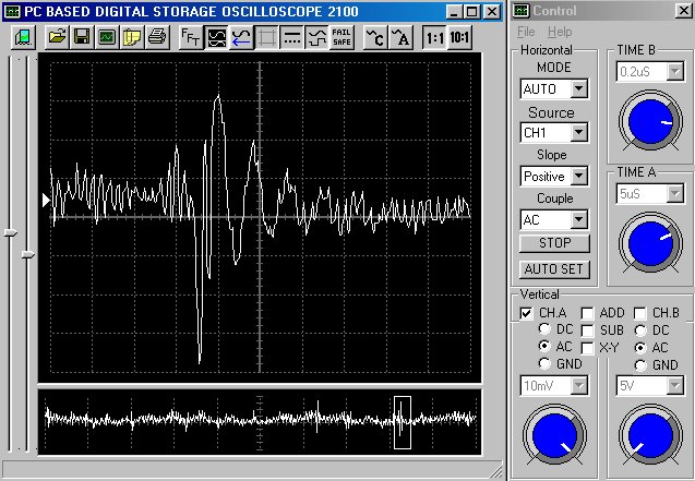 Empfindlichkeit pro Bildschirmteilung: 10 Millivolt (im Bild Vertical CH.A, Einstellung AC).
