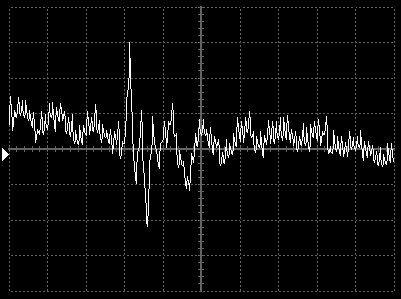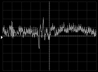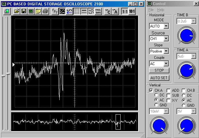 Empfindlichkeit pro Bildschirmteilung: 10 Millivolt (im Bild Vertical CH.A, Einstellung AC).