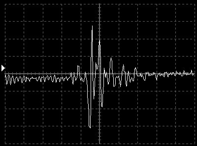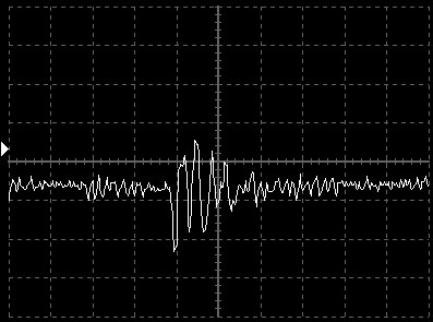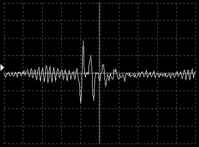 Empfindlichkeit pro Bildschirmteilung: 10 Millivolt (im Bild Vertical CH.A, Einstellung AC).