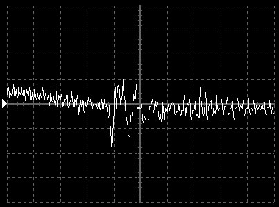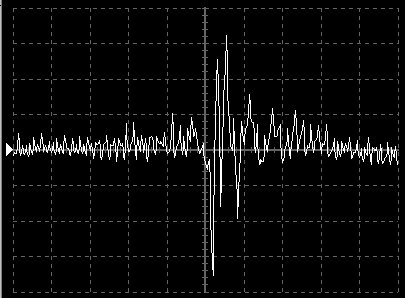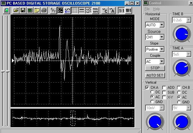 Empfindlichkeit pro Bildschirmteilung: 10 Millivolt (im Bild Vertical CH.A, Einstellung AC).