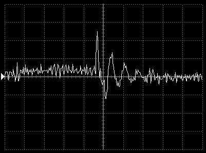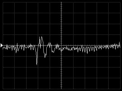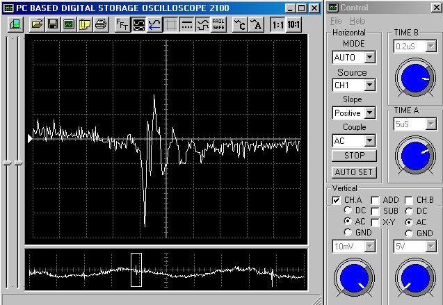Empfindlichkeit pro Bildschirmteilung: 10 Millivolt (im Bild Vertical CH.A, Einstellung AC).