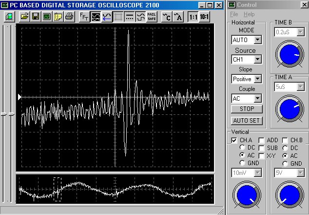 Empfindlichkeit pro Bildschirmteilung: 10 Millivolt (im Bild Vertical CH.A, Einstellung AC).