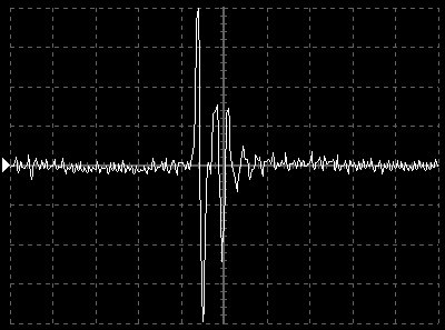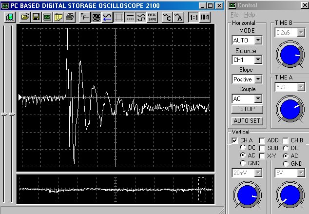 Empfindlichkeit pro Bildschirmteilung: 20 Millivolt (im Bild Vertical CH.A, Einstellung AC).