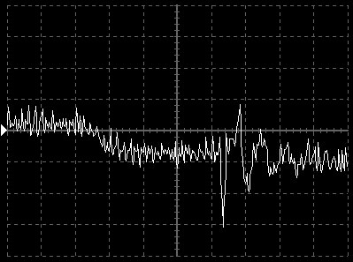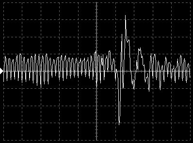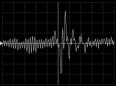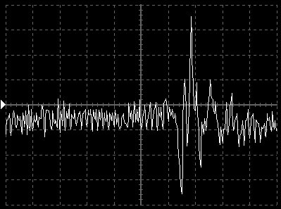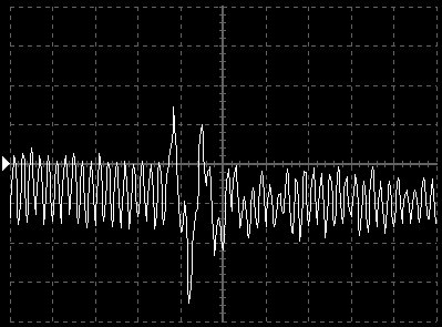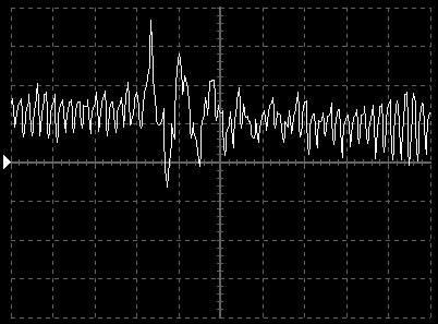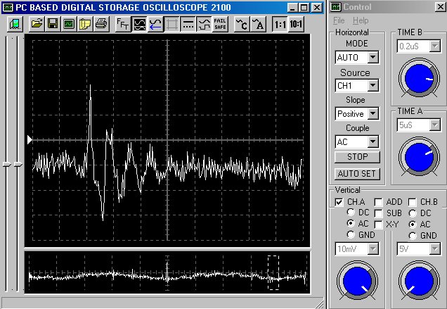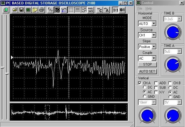 Empfindlichkeit pro Bildschirmteilung: 10 Millivolt (im Bild Vertical CH.A, Einstellung AC).