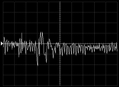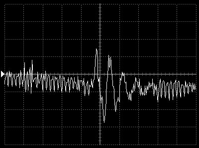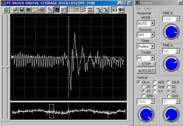 Empfindlichkeit pro Bildschirmteilung: 10 Millivolt (im Bild Vertical CH.A, Einstellung AC).