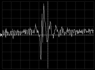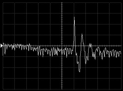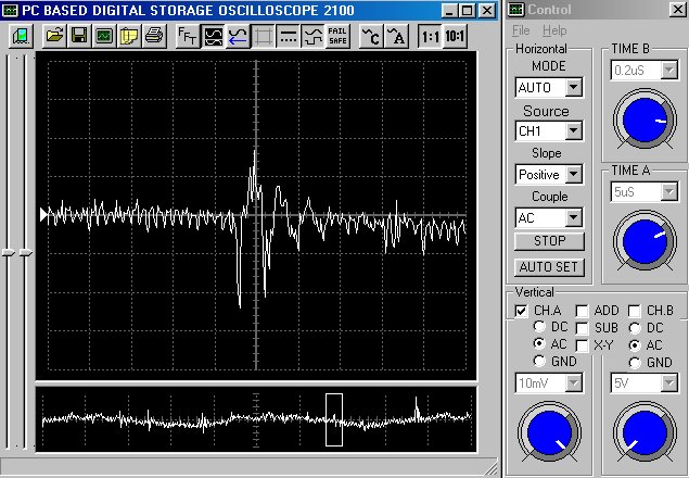 Empfindlichkeit pro Bildschirmteilung: 10 Millivolt (im Bild Vertical CH.A, Einstellung AC).