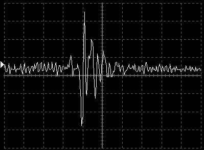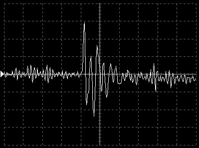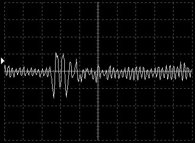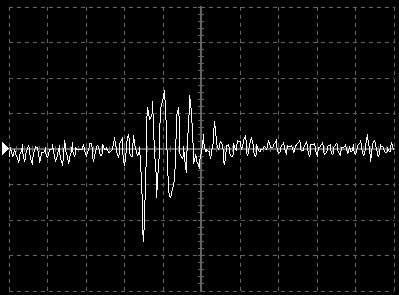 Empfindlichkeit pro Bildschirmteilung: 10 Millivolt (im Bild Vertical CH.A, Einstellung AC).
