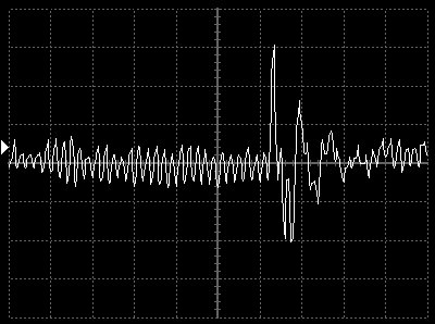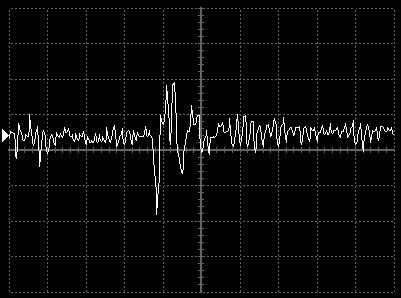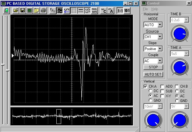 Empfindlichkeit pro Bildschirmteilung: 10 Millivolt (im Bild Vertical CH.A, Einstellung AC).