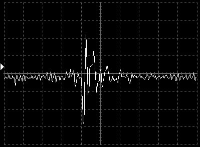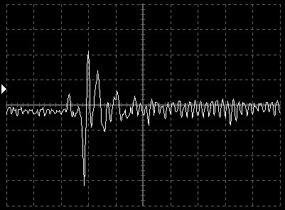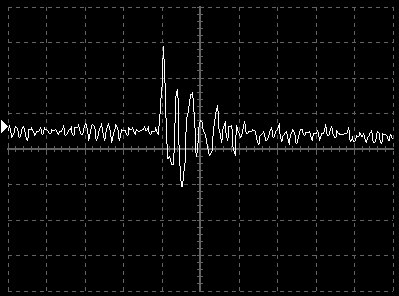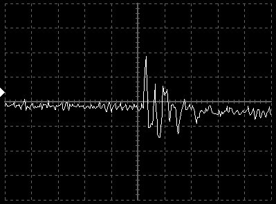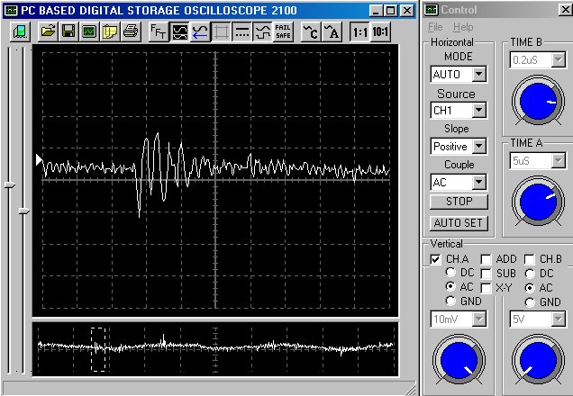 Empfindlichkeit pro Bildschirmteilung: 10 Millivolt (im Bild Vertical CH.A, Einstellung AC).