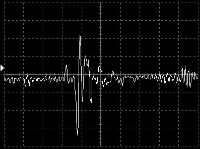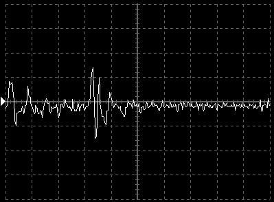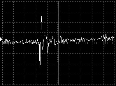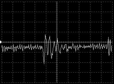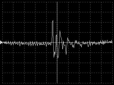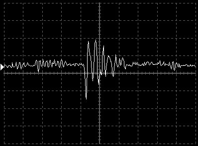 Empfindlichkeit pro Bildschirmteilung: 10 Millivolt (im Bild Vertical CH.A, Einstellung AC).