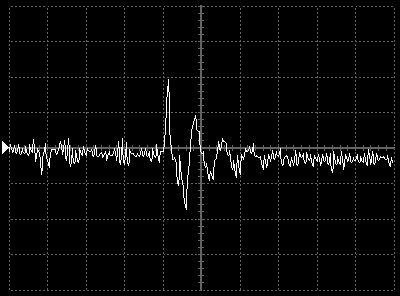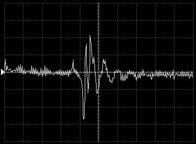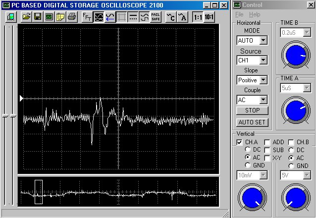Empfindlichkeit pro Bildschirmteilung: 10 Millivolt (im Bild Vertical CH.A, Einstellung AC).