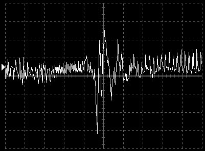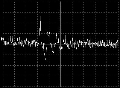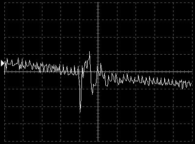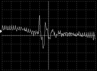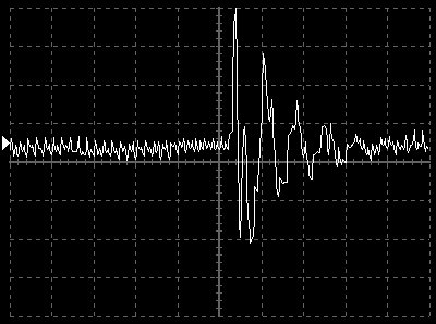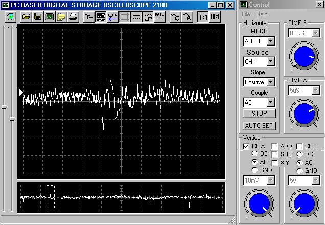 Empfindlichkeit pro Bildschirmteilung: 10 Millivolt (im Bild Vertical CH.A, Einstellung AC).