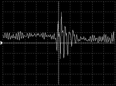 Empfindlichkeit pro Bildschirmteilung: 10 Millivolt (im Bild Vertical CH.A, Einstellung AC). Wir haben wegen der Stärke des von uns gemessenen Signals in Bild1 die Einstellung 0,2 Volt , in Bild2 und Bild3 50 Millivolt gewählt.