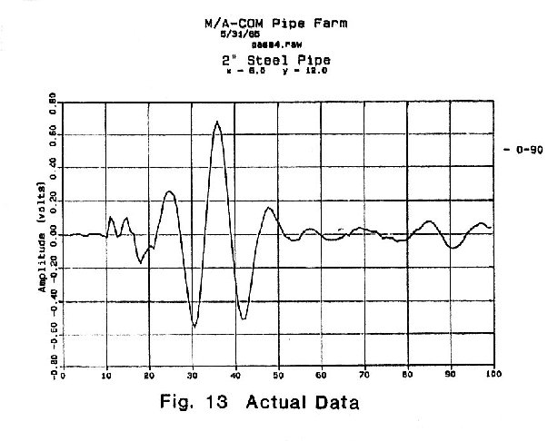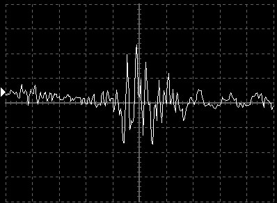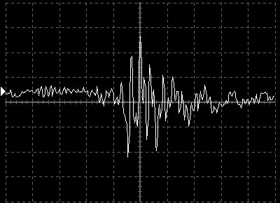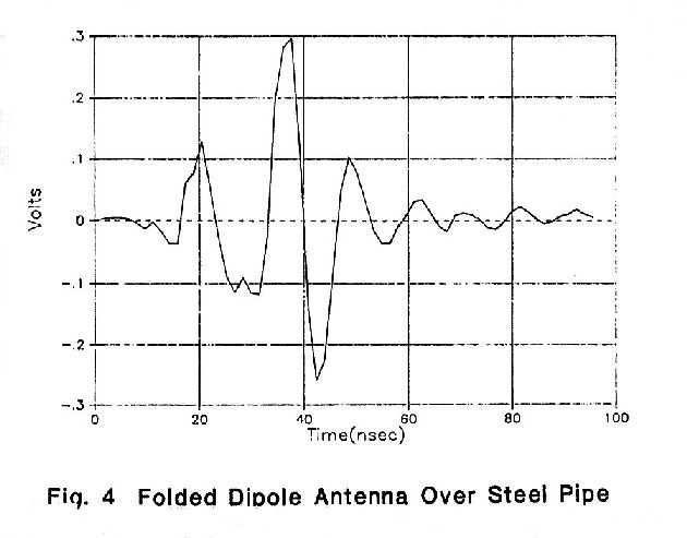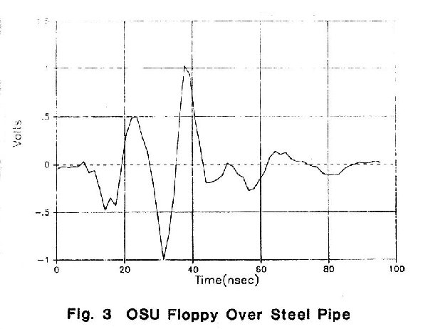 Die folgenden Bilder haben wir dem Buch " Improvement in Terrascan Instrumentation and Techniques for Location of Buried Pipe (PB89-159925)" von R.C. Miller, Chicago 1985, entnommen. Sie zeigen den Impulsverlauf von reflektierten Signalen des Terrascan Bodenradars. Es handelt sich dabei um einen Hochfrequenzimpuls mit einem breiten Frequenzspektrum. Die Grundfrequenz des erkennbaren Signals beträgt ungefähr 80 - 100 MHz. Die Grundfrequenz der oben wiedergegebenen Messungen beträgt einerseits 4 - 5 MHz für die ersten 3 Bilder und 12 - 15 MHz für die zweite Gruppe von Messungen. Daraus folgt, daß die oben angegebenen Signale in der Lage sind, tiefer in den Boden und durch Mauern einzudringen und verwertbare Daten zu liefern.