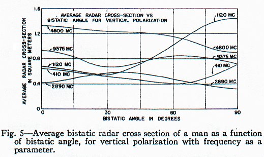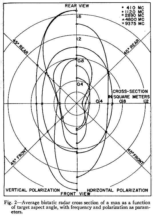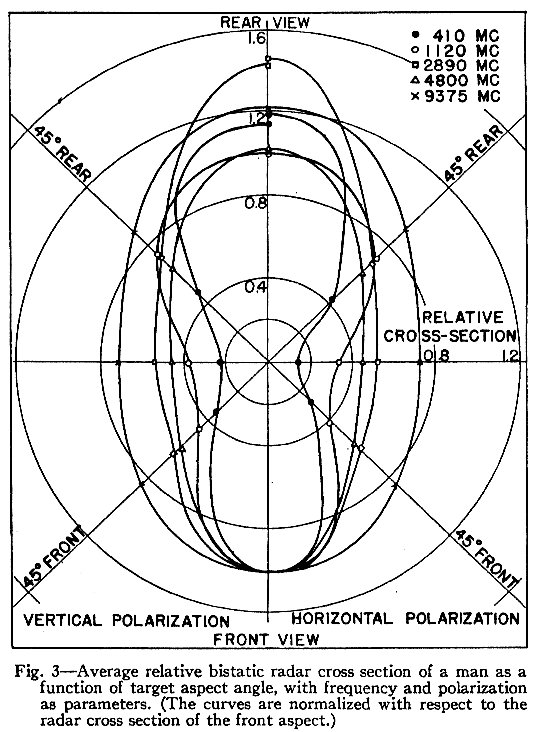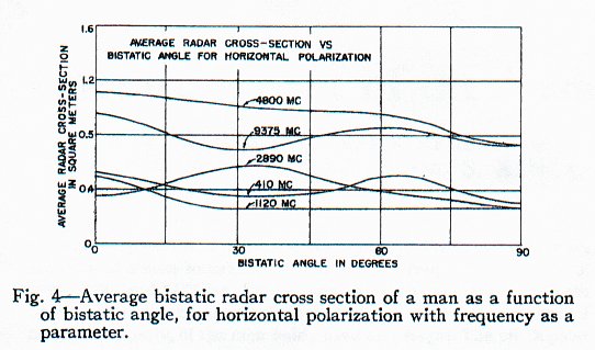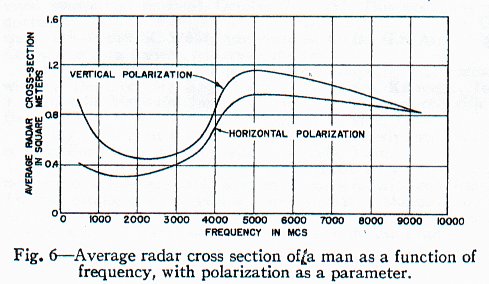 (...) Der Radarquerschnitt des zur Messung verwendeten Mannes lag zwischen 0,033 und 2,33 Quadratmetern. Diese extremen Werte wurden bei 410 MHz erhalten. Der kleinere Wert ergab sich für horizontale Polarisation und bei Blick auf die Seite des Mannes, der größere für vertikale Polarisation und Blick auf die Rückseite des Mannes. Dieses Ergebnis konnte man bei einem fast zylindrischen Ziel wie einem Menschen erwarten. Bei zunehmender Frequenz gab es weniger Unterschiede im Radarquerschnitt zwischen den zwei Polarisationen.