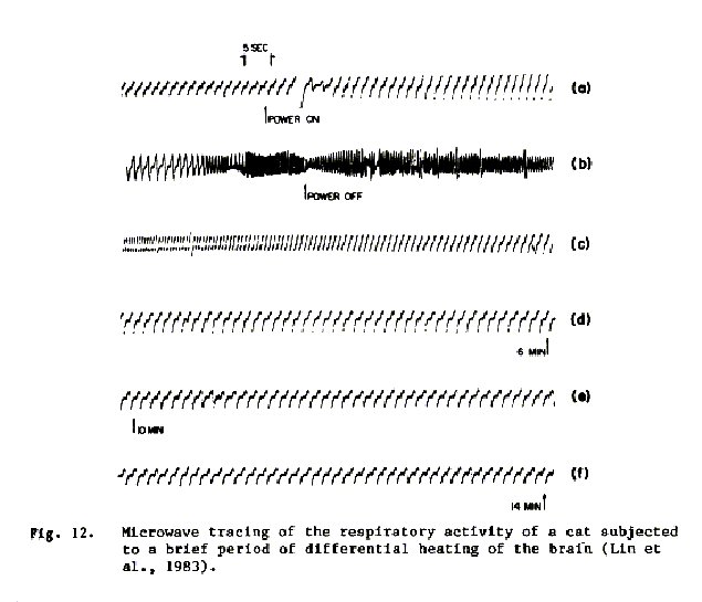 Bild 12 zeigt den mit Mikrowellen gemessenen Verlauf der Atmung bei einer Katze, deren Kopfbereich erwärmt wurde. Ein gewöhnlicher Hornstrahler für 10 GHz wurde in einer Entfernung von ungefähr 2 Metern auf den oberen Teil des Körpers gerichtet. Man sieht, daß der Sensor in der Lage ist die Änderung in der Atmung zu messen. Die Atemrate nahm mit der Erwärmung zu. Nach einer Periode der Verstärkung der Atmung folgte ein Zeitraum mit sehr schneller Atmung. Ungefähr 14 Minuten nach dem Ende der Erwärmung des Gehirns endete das schnellere Atmen. Diese Meßmethode hat mehrere Vorteile gegenüber den üblichen Verfahren, denn es wird kein physischer Kontakt zum Versuchssubjekt benötigt. Probleme wie Hautreizung, Behinderung der Atmung und Verbindung mit Elektroden werden leicht vermieden.