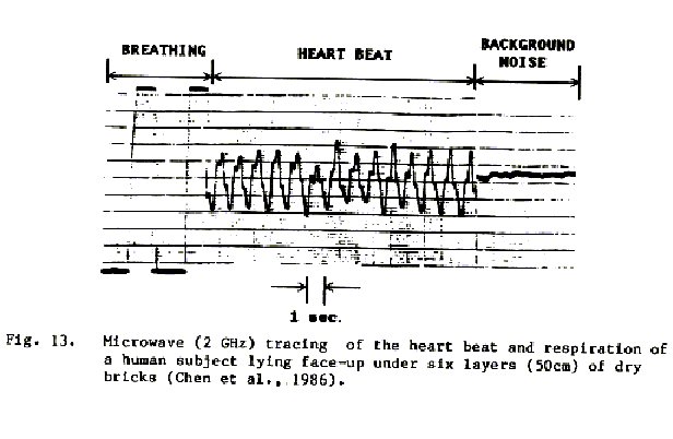 Es wurde über die Messung von Herzschlag und Atmung über Entfernungen von mehr als 30 Metern berichtet. Meistens wurden Mikrowellenstrahlungen mit Frequenzen von 2 und 10 GHz verwendet. (...) Solche Systeme sind in der Lage, den Herzschlag und die Atmung von Personen zu messen, die in einer Entfernung von mehr als 30 Metern auf dem Boden liegen. Ein System mit einer Frequenz von 2 GHz war sogar in der Lage, Herzschlag und Atmung von Personen hinter einer trockenen 1 Meter breiten Ziegelwand zu messen ( Bild 13 ). Man kann sich vorstellen, daß ähnliche Geräte bei verschiedenartigen Rettungseinsätzen verwendet werden können, bei denen direkter Kontakt mit den Betroffenen entweder unmöglich oder nicht wünschenswert ist.