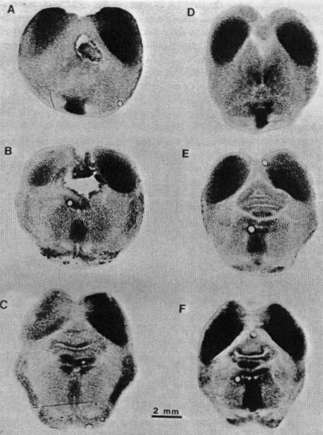 In Bild 1 A wird eine Autoradiographie eines Tieres das akustischen Klicks ausgesetzt war gezeigt. Man erkennt eine offensichtliche Asymmetrie der optischen Dichten bei dieser Autoradiographie wobei sich der dunkelste Bereich im zentralen Kern der Colliculus Inferior auf der dem funktionsfähigen Ohr gegenüberliegenden Seite befindet. Dieses Ergebnis war zu erwarten da sie meisten von einer Schnecke des Gehörs aufsteigenden Nervenwege im zentralen Kern der Colliculus Inferior auf der gegenüberliegenden Seite des Gehirns enden. Über ähnliche Muster der ( 14C )2-Deoxy-D-Glucose Aufnahme in der Colliculus Inferior wurde auch von anderen Forschern berichtet, die Tiere verwendet haben, bei denen ein Gehörgang verschlossen oder eine Schnecke zerstört worden war.
