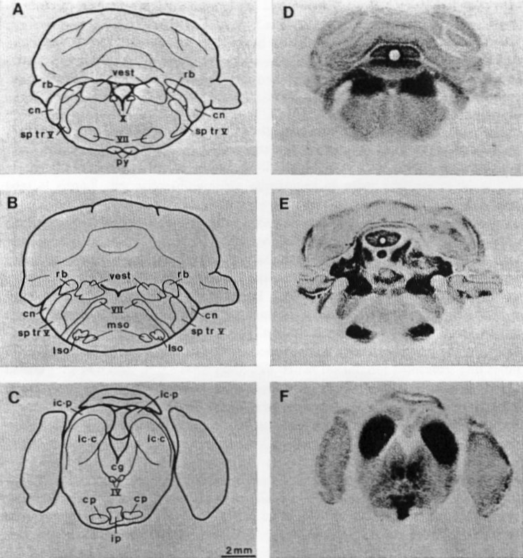 Bild 2. Autoradiographien der ( 14C )2-Deoxy-D-Glucose Aufnahme in drei Ebenen des Gehirns von mit gepulsten Mikrowellen bestrahlten Ratten. Die Autoradiographien sind auf der rechten Seite nacheinander von Kaudal ( Schwanzwärts) nach Rostral ( Kopfwärts ) angeordnet ( D, E und F ). Die zur Identifizierung der Strukturen der Schnitte verwendeten Zeichnungen befinden sich jeweils links neben der entsprechenden Autoradiographie. Die verwendeten Abkürzungen bedeuten: cg: zentrales Grau; cn: kochleärer Kern; cp: zerebraler Stiel; ip: interpedunkulärer Kern; ic.c: zentraler Kern des Colliculus Inferior; ic.p: perizentraler Bereich des Colliculus Inferior; lso: seitliche superiore Olive; mso: mittlere superiore Olive; IV: Kern des trochleären Nerven; VII: Nervus Facialis; py: Pyramis; rb: restiformer Körper; sp tr V: dem Rückenmark zugewandter Teil des Trigeminusnerven; vest: vestibulärer Kern; X: motorischer Kern des Vagusnerven