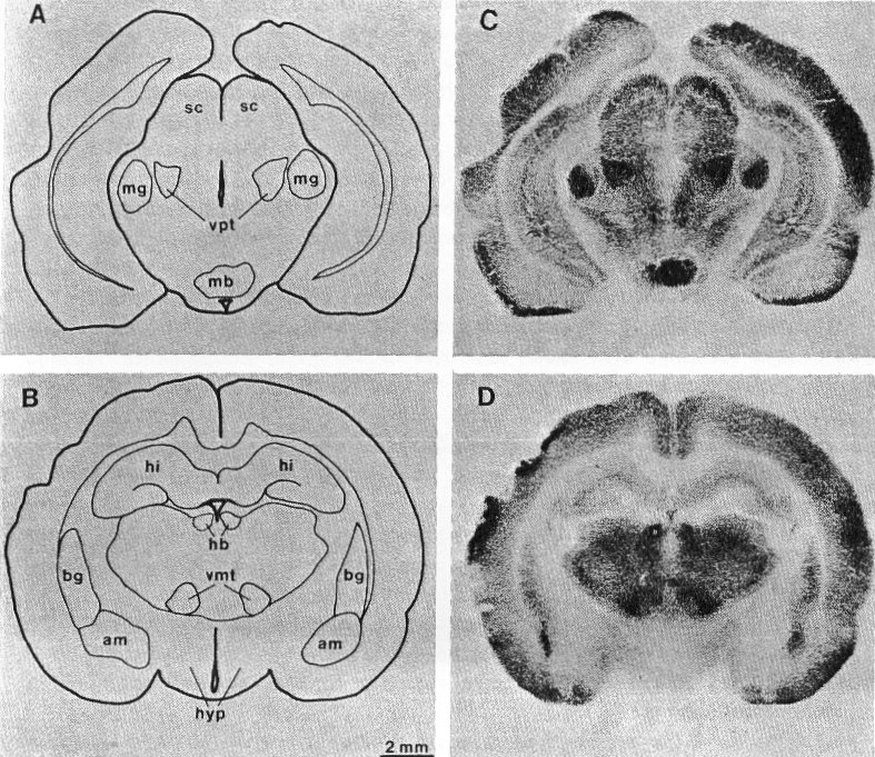 Bild 3. Autoradiographien der ( 14C )2-Deoxy-D-Glucose Aufnahme in rostralen ( kopfwärtigen ) Schnitten des Gehirns einer mit gepulsten Mikrowellen bestrahlten Ratte. Autoradiographien von weiter caudal ( schwanzwärts ) gelegenen Schnitten dieses Gehirns sind in Bild 2 wiedergegeben. Abkürzungen: am: Mandelkörper; bg: Basalganglion; hb: Zirbeldrüsenstiel; hi: Hippocampus; hyp: Hypothalamus; mb: warzenförmige Körper; mg: Corpus geniculatum mediale; sc: Colliculus Superior; vmt: bauchseitiger mittlerer thalamischer Kern; vpt: bauchseitiger hinterer thalamischer Kern. Die Wölbungen und Falten am Rand der beiden Autoradiographien sind durch das Schneiden entstanden.