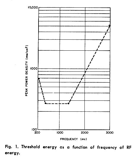 Tabelle1 zeigt, daß die Spitzenfeldstärke nicht sehr hoch ist. Aus unseren Versuchen schließen wir, daß bei geringeren Umgebungsgeräuschen die Grenzwerte der zur Wahrnehmung des Radiofrequenztones notwendigen Feldstärke viel geringer wären. Wenn der Grenzwert in Abhängigkeit von der Frequenz dargestellt wird ( Bild 1 ) erhält man eine Kurve die der Kurve der Eindringtiefe von Radiofrequenzenergie in den Kopf ähnelt.