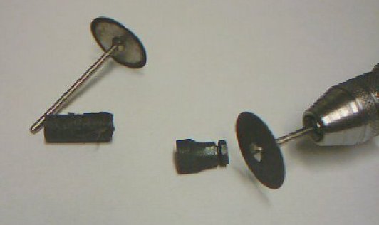 Man schneidet von einem Ferrit-Bauteil (Ferritstab aus einem Mittelwellenradio, Ferritdrosseln von Computerkabeln usw.) ein entsprechendes Stück ab. Bei manchen Ferrit-Bauteilen genügt eine normale Trennscheibe. Bei besonders harten Ferrit-Bauteilen verwendet man eine Diamanttrennscheibe (im Bild links), wobei die Schnittstelle ständig mit genügend Wasser zu kühlen ist, da sonst das Diamantwerkzeug schnell zerstört wird. Aus diesem Grund sollte auch nur wenig Druck ausgeübt werden.