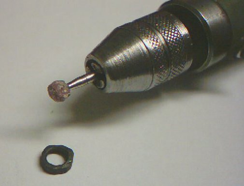 Um einen Ferritring herzustellen, wird nun mit einem Schleifstift entsprechender Größe ein Loch in die Ferritscheibe geschliffen.