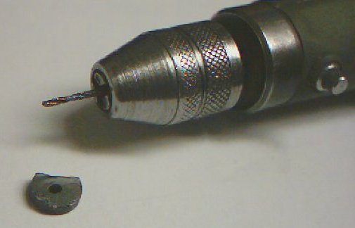 Ein Ferritperle wird hergestellt indem man ein kleines Loch (hier mit einem Diamantbohrer) durch eine Ferritscheibe bohrt. Auch bei dem Diamantbohrer ist die Bohrstelle immer naß zu halten und beim Bohren wenig Druck auszuüben.