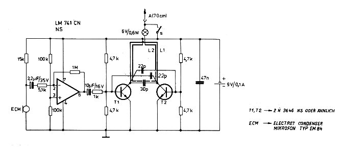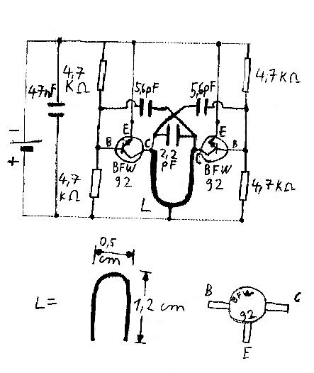 In diesen Sender werden anstelle der ursprünglichen Transistoren Mikrowellentransistoren vom Typ BFW 92 eingebaut. Außerdem müssen zur Erzielung der höheren Frequenz eine andere Spule und ein anderer Schwingkreiskondensator eingesetzt werden. Mit der Verstärkerschaltung und dem Mikrofon des vorhergegangenen Bildes läßt sich auch dieser Sender zur Übertragung von Sprache verwenden, wobei der Ausgang des Verstärkers ebenfalls auf die Basis eines der Transistoren gegeben wird. Dieser Sender kann mit einer Spannung von 3 - 5 Volt betrieben werden und arbeitet, je nach Spulengröße und Kondensatorkapazität im Bereich von ca. 1 GHz. Da die Transistoren BFW 92 für eine Frequenz von bis zu 1,6 GHz ausgelegt sind, läßt sich sicher noch eine etwas höhere Frequenz erreichen. Es gibt aber auch ähnliche Transistoren, die weitaus höhere Frequenzen erreichen können: