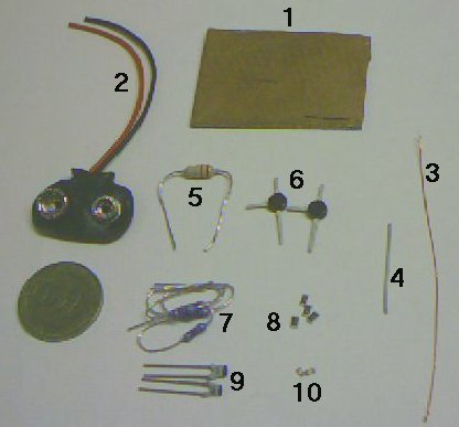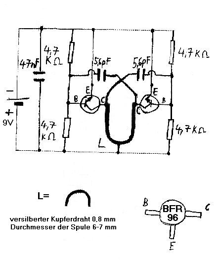 Es handelt sich im Prinzip um den gleichen Mikrowellensender wie hier beschrieben. Allerdings werden hier die leistungsfähigeren Transistoren BFR 96 verwendet, die Abmaße der Spule haben sich geändert und es ist kein Schwingkreiskondensator vorhanden, da die Kapazität der Transistoren ausreicht. Im folgenden Bild sind alle notwendigen Bauteile zu sehen.