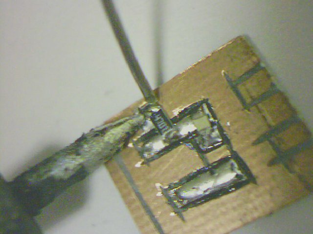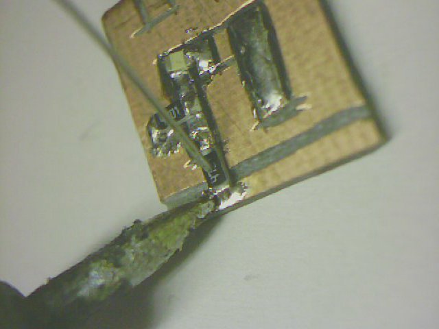 Dann wird die andere Lötstelle mit ganz wenig Lötzinn angelötet. Zuletzt kann die erste Lötstelle noch einmal mit ganz wenig Lötzinn nachgelötet werden. Zum Löten verwendet man einen Lötkolben mit möglichst geringer Leistung (10 oder 15 Watt) und dünner Lötspitze. Der Lötkolben wird wie auf dem Bild zu sehen so angesetzt daß Bauteil und Platine gleichzeitig erhitzt werden, wobei das Lötzinn nicht direkt auf die Lötspitze sondern an die Lötstelle gegeben wird. Es reicht vollkommen das Lötzinn ganz kurz zu erhitzen und den Lötkolben sofort wegzuziehen nachdem es geschmolzen ist. Dabei sollte man aufpassen, daß das Lötzinn keine Verbindung zwischen den einzelnen Lötstellen herstellt. Deswegen ganz wenig Lötzinn verwenden und die Lötstellen nur kurz, ca. 1-2 Sekunden oder noch kürzer erhitzen.