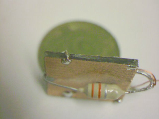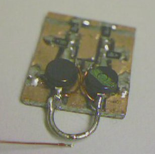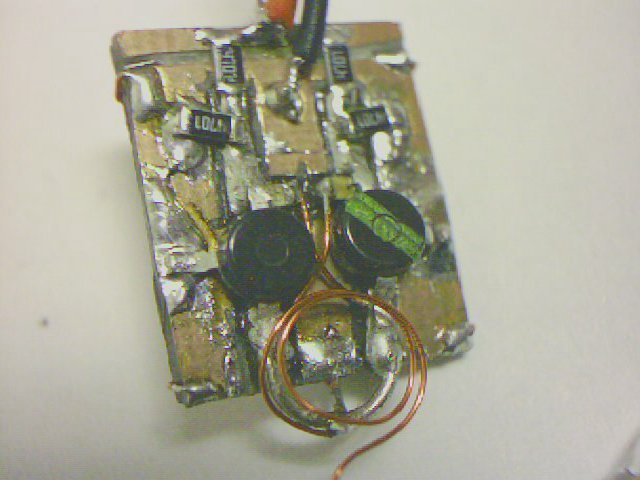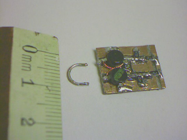 Nun wird auf der Rückseite die UKW Drossel an die Mitte der Spule gelötet. Dabei aufpassen daß die Antenne angelötet bleibt. Notfalls die Antennenspule mit etwas Klebstoff befestigen. Auf der anderen Seite wird die Zuleitung der UKW Drossel um die Platine herumgeführt, und an der Lötfläche für die positive Stromversorgung angelötet. Es darf keine Verbindung zwischen der Unterseite der Platine und der Zuleitung der UKW Drossel geben. Dazu muß am Rand der Platine möglicherweise die Kupferbeschichtung entfernt werden (links im Bild). Jetzt wird die Unterseite der Platine mit der negativen Leiterbahn an der Oberfläche verbunden. Dazu wird ein Stück dünner Draht an allen vier Ecken über die Kante der Platine gelötet. Aber Vorsicht: Keine Verbindung zur positiven Leiterbahn auf der Oberseite herstellen.