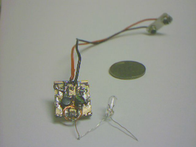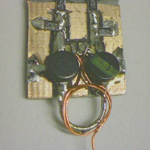 Der fertige Sender mit Stromzuleitung. Verwendet wird eine 9 Volt Blockbatterie oder ein Netzgerät. Bei zu hoher Spannung (z.B. 12 Volt) werden die Transistoren zerstört. An die Spule (Kupferlackdraht) ist die Glühbirne angelötet. An deren anderer Seite wird eine auf die Sendefrequenz abgestimmte Antenne angelötet (1/4 der Wellenlänge, also bei 1 GHz 7,5 cm). Wenn der Sender an die Stromversorgung angeschlossen wird und die Antenne an die Glühbirne, leuchtet diese auf wenn der Sender funktioniert. Falls der Sender nicht funktioniert, überprüft man die gesamte Schaltung auf richtige Montage der Bauteile, auf Kurzschlüsse zwischen den Leiterbahnen durch zuviel Lötzinn sowie darauf daß die Transistoren nicht zerstört sind, was leicht durch Verpolen der Stromversorgung oder zu hohe Spannung passieren kann. Die Transistoren prüft man mit einem Vielfachmeßgerät das auch über einen Transistorprüfer oder einen Diodenprüfer verfügt. Wie das gemacht wird steht in der Anleitung des Meßgerätes. Mit diesem Meßgerät kann man auch prüfen ob es Kurzschlüsse zwischen den Leiterbahnen gibt, zum Beispiel durch zuviel Lötzinn unter den Bauteilen.