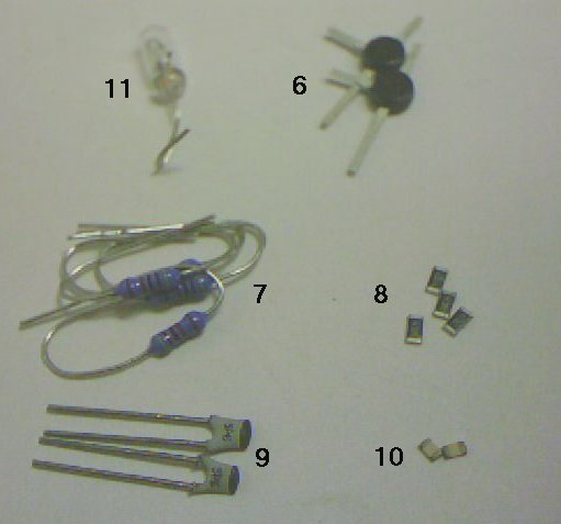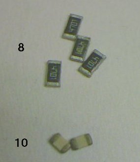 SMD Widerstände (8) und Kondensatoren (10). Wer ungeübt ist, sollte jeweils 1-2 Widerstände und Kondensatoren mehr kaufen als er benötigt, denn sie gehen leicht verloren.