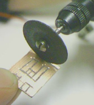 Mit einer Miniaturbohrmaschine und einer Trennscheibe wird die Kupferfolie auf der Platine vorsichtig zurechtgeschliffen um die Lötstellen herzustellen.