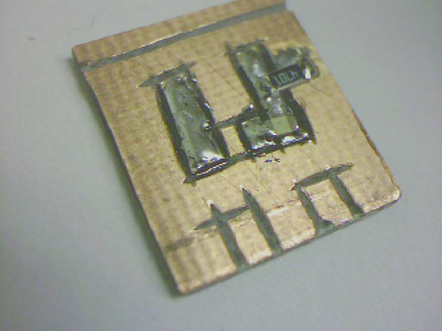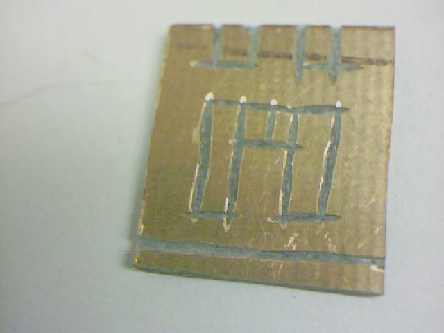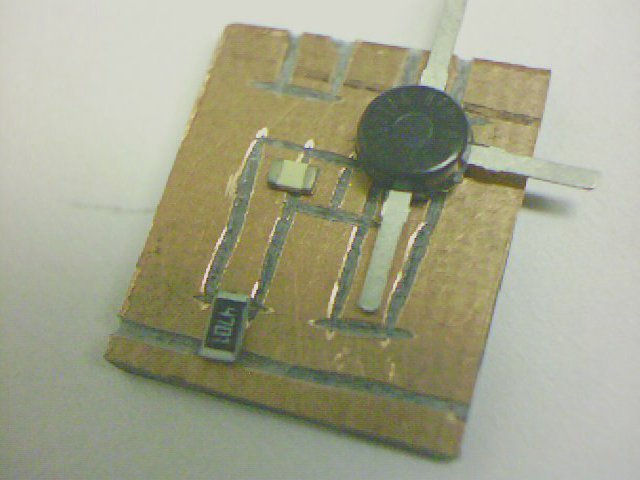 Beim Fräsen orientiert man sich an der Größe der Bauteile. Dazu kann man sie zwischendurch zur Kontrolle jeweils einzeln an die entsprechende Stelle legen um zu kontrollieren, ob die Lötstelle sich am richtigen Platz befindet und die richtige Größe hat. Weiter unten finden Sie ein Bild des fertigen Senders, das Sie als Vorlage für das Layout der Schaltung nehmen können. Wenn ein Schnitt mit der Trennscheibe an der falschen Stelle oder zu groß gemacht worden ist, so sollte man eine neue Platine anfertigen. Wer entsprechendes Werkzeug hat, kann die Platine natürlich auch ätzen. Notfalls kann man auch mit einem kleinen scharfen Messer (kleines Teppichmesser) die Kupferplatine an den entsprechenden Stellen zuerst durchtrennen und dann vorsichtig abkratzen ohne sich in die Finger zu schneiden.